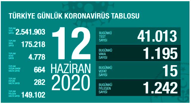 Sağlık Bakanı Fahrettin koca 12 Haziran Türkiye’nin Günlük Koronavirüs Tablosu’nu kişisel Twitter hesabından paylaştı. Buna göre; son 24 saatte 41 bin 13 test yapıldı ve bin 195 yeni vaka tespit edildi. 15 hasta ise hayatını kaybetti. Açıklanan son verilerin ardından Türkiye’de koronavirüs nedeniyle hayatını kaybedenlerin sayısı 4 bin 778’e, toplam vaka sayısı ise 175 bin 218’e yükseldi.