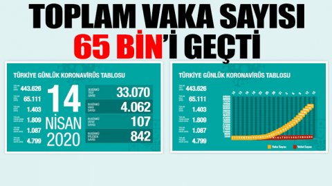 14 Nisan korona tablosu ve vaka sayısını açıkladı.Türkiye’de koronavirüs nedeniyle hayatını kaybedenlerin sayısı 107 yükselerek 1403’e, toplam vaka sayısı 4 bin 62 artarak 65 bin 111 oldu.