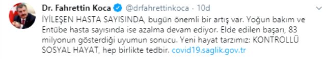 26 Mayıs Korona Tablosu Ve Vaka Sayısını Açıkladı.Öte yandan Sağlık Bakanı Fahrettin Koca, Türkiye’nin Günlük Koronavirüs Tablosu’nu açıkladığı paylaşımında, “İyileşen hasta sayısında, bugün önemli bir artış var. Yoğun bakım ve Entübe hasta sayısında ise azalma devam ediyor. Elde edilen başarı, 83 milyonun gösterdiği uyumun sonucu. Yeni hayat tarzımız: Kontrollü sosyal hayat, hep birlikte tedbir.” ifadelerini kullandı.