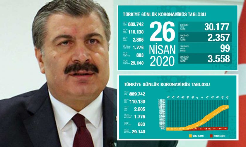 26 Nisan korona tablosu ve vaka sayısını açıkladı.Sağlık Bakanı Fahrettin Koca, Türkiye’de koronavirüsten hayatını kaybedenlerin sayısının son 24 saatte 99 artarak 2 bin 805’e, vaka sayısının ise 2 bin 357 artarak 110 bin 130’a yükseldiğini açıkladı.