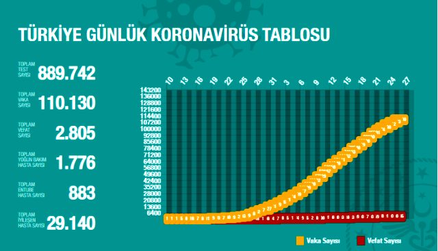 Açıklanan son rakamların ardından Türkiye’de koronavirüsten hayatını kaybedenlerin sayısı 99 artarak 2 bin 805’e, vaka sayısı ise 2 bin 357 artarak 110 bin 130’a yükseldi.