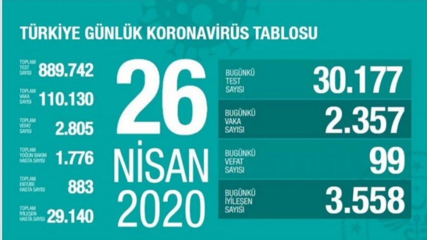 26 Nisan korona tablosu ve vaka sayısını açıkladı.Sağlık Bakanı Fahrettin Koca, 26 Nisan koronavirüs vaka sayılarını açıkladı. Buna göre, Türkiye’de koronavirüsten hayatını kaybedenlerin sayısı son 24 saatte 99 artarak 2 bin 805’e, vaka sayısı ise 2 bin 357 artarak 110 bin 130’a yükseldi. İyileşen hasta sayısı ise son 24 saatte 3 bin 558 artarak 29 bin 140’a yükseldi.