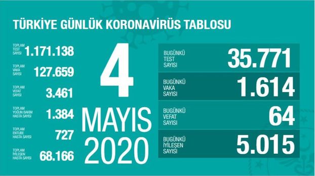 Toplam test sayısı 1 milyon 171 bin 138, toplam vaka sayısı 127 bin 659, toplam vefat sayısı 3 bin 461, toplam yoğun bakım hasta sayısı 1384, toplam entübe hasta sayısı 727, toplam iyileşen hasta sayısı 68 bin 166 oldu.