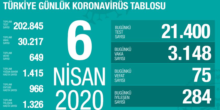 6 Nisan korona tablosu ve vaka sayısını açıkladı.Tüm dünyada olduğu gibi Türkiye’de de etkisi devam eden yeni tip koronavirüs salgını insan sağlığını doğrudan etkilemeye devam ediyor. Sağlık Bakanlığı tarafından yayınlanan son verilere göre, Türkiye’de son 24 saat içinde 21.400 test yapıldı. Yapılan test sayısı toplamda 202.845 olarak açıklandı. Son 24 saat içinde 3.148 yeni vaka ortaya çıkarken ülkemizdeki toplam koronavirüs vaka sayısı 30 bin 217 olarak belirtildi.