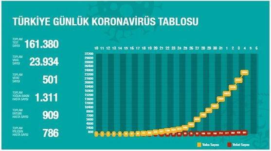 Toplam test sayısı 161 bin 380, toplam vaka sayısı 23 bin 934, toplam vefat sayısı 501, toplam yoğun bakım hasta sayısı 1311, toplam entübe hasta sayısı 909, toplam iyileşen hasta sayısı 786 oldu.