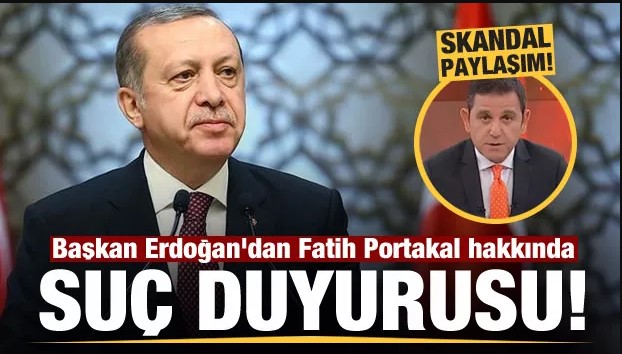 Erdoğan’dan Fatih Portakal hakkında suç duyurusu.Başkan Erdoğan, sunucu Fatih Portakal hakkında İstanbul Cumhuriyet Başsavcılığı’na suç duyurusunda bulundu. Erdoğan’ın, sosyal medyada yalan ve halkı manipüle etmeye yönelik ifadeler paylaştığı için Portakal hakkında suç duyurusunda bulunduğu öğrenildi..