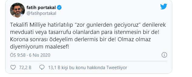 “Fox TV haber sunucusu olan şüpheli Fatih Portakal kendisine ait olan @fatihportakal adlı Twitter hesabından paylaştığı “Tekalifi Milliye hatırlatılıp “zor günlerden geçiyoruz” denilerek mevduatı veya tasarrufu olanlardan para istenmesin bir de! Korona sonrası ödeyelim derlermiş bir de! Olmaz olmaz diyemiyorum maalesef!” şeklindeki iletisi ile Müvekkilimin konuşmasını gerçek manasından uzaklaştırılarak kamuoyunda yanlış bir algı oluşturmayı amaçlamıştır.
