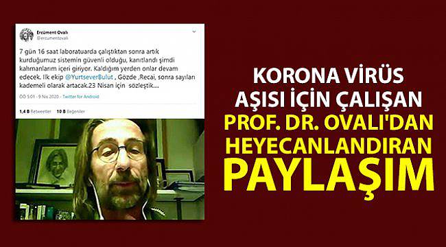 Prof. Dr. Ercüment Ovalı, Korona virüse karşı aşı ve tedavi çalışmalarını yürütmek için laboratuvarda karantinaya girmişti. Prof. Dr. Ovalı, sosyal medya hesabı üzerinde yaptığı paylaşımda, çalışmaların durumu hakkında bilgi aktardı. Prof. Dr. Ovalı yaptığı paylaşımda, “Saat 23. Virüsün 72 saatte yapması gereken etkiden çok daha fazlasını yaptığını gözlemledik. Vero hücrelerini beklenenden kısa sürede parçalamış. Neden? Çözmeye çalışacağız. Sonuç: Test tekrarı…” ifadelerine yer verdi.