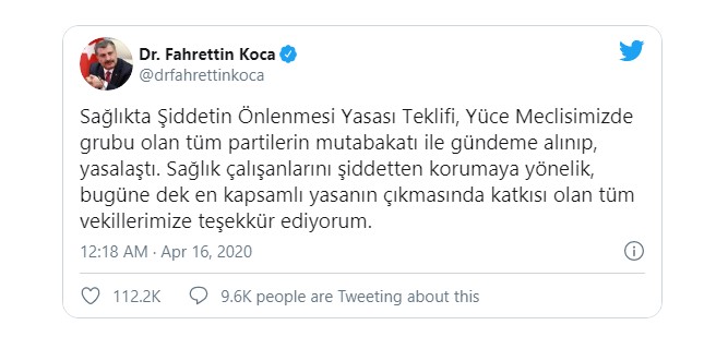 Sağlık Bakanı Fahrettin Koca, TBMM’de söz konusu kanun teklifinin kabul edilmesinin ardından Twitter üzerinden milletvekillerine teşekkür etti.