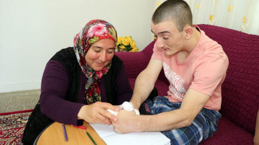 Daha önce protezi vardı, protezle yürüyordu. Çoğu işini yine ben yapıyordum ama kendi de normal yürüyebiliyordu. Ama 2013’ten bu yana yürüyemiyor. O zamandan beri sırtımda indirip, sırtımda çıkartıyorum. Elimden geldiği kadar çocuklarımı sosyal hayattan koparmamaya çalışıyorum. Okuluna götürüyorum, özel eğitime gidiyor. Kaynaştırma öğrencisi olarak 8. sınıfa kadar okudu. Ben kendimi, hayatımı çocuklarıma adadım. Onlar yatarsa yatıyorum her şeyim çocuklarım benim. 7 gün 24 saat beraberiz. Çok seviyorum, sevgim sayesinde ayakta duruyorum. Rabbim bu rahatsızlığı, acıları hiçbir aileye yaşatmasın. Çok acılar çektik, çok ameliyatlar oldu, çok kırıklarımız oldu. Oğlum 50’yi geçkin ameliyat oldu. Şu anda çok ciddi açık yaraları var. Sürekli günde 4-5 kez belki daha fazla pansuman yapıyorum. Günüm pansumanla geçiyor” dedi.