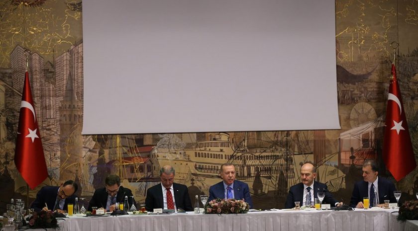 Erdoğan medya yöneticileriyle bir araya geldi.Barış Pınarı Harekatı’nın Suriye’nin normalleşmesi, oradaki iç savaşın bitirilmesi noktasındaki etkisinin ne olacağına yönelik soruya da Erdoğan, burada bir defa bir sınır ötesi harekat olduğunu söyledi. Bunun sosyolojik bir olay olmadığını vurgulayan Erdoğan, “Tamamıyla adeta teröre karşı verilen bir mücadeleyle burada 32 kilometre derinlikte, bir de 444 kilometre batıdan doğuya bir alan. Bu alan temizlendikten sonra bu işe nokta konulabilir. Ama önce bu alanı bir defa temizlememiz lazım. Çünkü matematik bir olay olsa iki kere iki dört dersiniz, bitirirsiniz ama böyle bir şey değil. Bunun zamanlaması diye bir şey de olmaz, ancak yol haritası olur. Bu yol haritası da 32 kilometre derinlik, 444 kilometre de Batı’dan Doğu’ya çarptık mı bir alan meydana geliyor” diye konuştu.