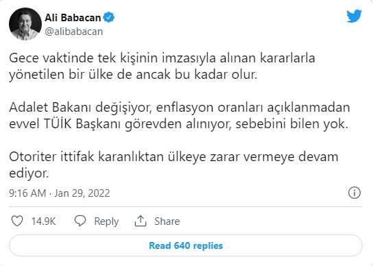 Allah bize kısmet versin, doğru olanı yapalım ve bizi yanlış yapmaktan korusun.AK Parti’den ayrılan ve Deva Parti’yi kuran eski başbakan yardımcısı Ali Babacan, değişikliklere tepki göstermek için Twitter’a gitti.“Adalet bakanı değiştiriliyor, TÜİK başkanı enflasyon verileri yayınlanmadan görevden alınıyor. Kimse nedenini bilmiyor” dedi.