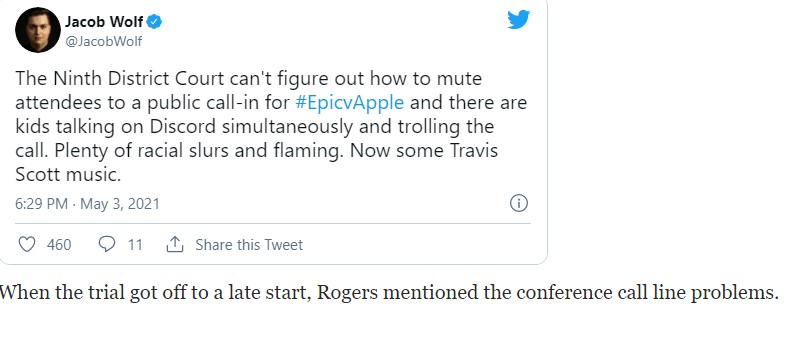 Dokuzuncu Bölge Mahkemesi, #EpicvApple için halka açık bir çağrıya katılanların sesini nasıl kapatacağını çözemiyor ve aynı anda Discord’da konuşan ve çağrıyı trolleyen çocuklar var. Bol miktarda ırkçı hakaret ve ateşli. Şimdi biraz Travis Scott müziği.