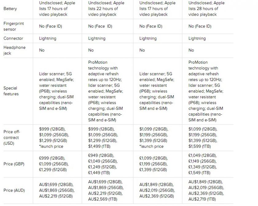 En yeni Pro modelleri, daha küçük bir çentik de dahil olmak üzere bazı yeni tasarım özellikleri sunar, ancak en büyük değişiklikler arasında daha uzun pil ömrü, üç yeni kamera, 120 Hz ekran ve geçen yılın Pro modellerindeki depolamanın iki katı olan maksimum 1 TB depolama kapasitesi yer alıyor. Belirli numaralar istiyorsanız, yan yana bir özellik tablosunu görmek için bu sayfanın en altına gidin.