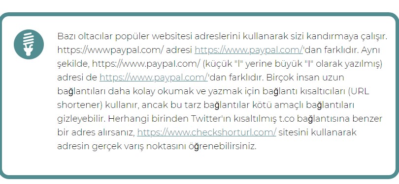 Bu yüzden şifrenizi herhangi bir siteye girmeden önce, internet tarayıcınızın adres satırına bakın. Tarayıcınız size bulunduğunuz sayfanın gerçek adresini gösterecektir. Eğer bu adres giriş yaptığınızı sandığınız servisin adresiyle çelişiyorsa, şifrenizi kesinlikle girmeyin! Bir websitesinde bir şirketin logosunun gözükmesi o sitenin gerçek olduğu anlamına gelmez. Herhangi biri bir logoyu veya bir tasarımı kopyalayarak sizi şifrenizi paylaşmak için kandırabilir.