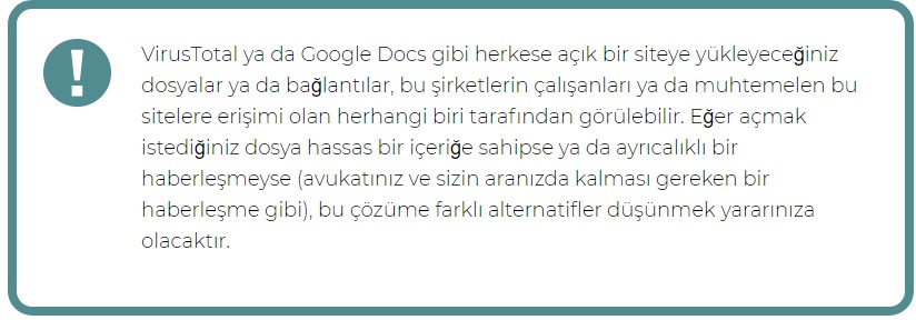 Ayrıca güvenmediğiniz bağlantıları ya da dosyaları VirusTotal’e gönderebilirsiniz. VirusTotal dosyaları ve bağlantıları birkaç farklı anti-virüs mekanizmasını kullanarak kontrol eder ve bu kontrolün sonuçlarını rapor eder. Ancak bu yöntem, anti-virüsler genelde yeni kötü amaçlı yazılımları ya da hedefli saldırıları saptamakta başarısız olduğu için dört dörtlük değildir. Ancak halihazırda bir anti-virüs programı kullanmıyorsanız, bu yöntem hiç yoktan iyidir.